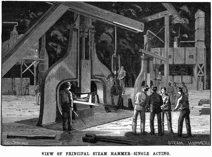 the driving wheels upon their axles. The steam hammer shown is