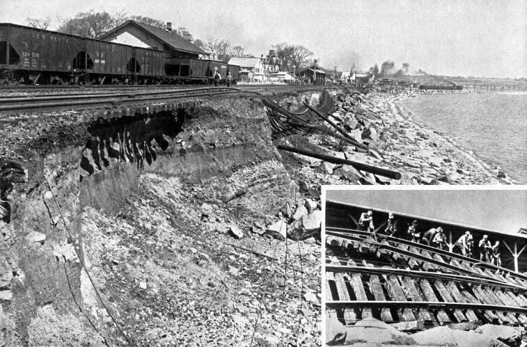Man-Power Alone can Right these Twisted Rails . . . Foot by Foot they Must be Jacked Up and Underpinned with Rip-Rap . . . Followed by Tons of Fill . . . A Procedure More Difficult than Laying New Track