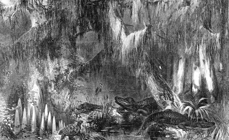moss hanging in masses from the cypress-trees, whose gray trunk,