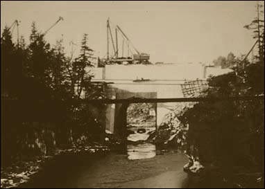 This slide shows the Ashokan dam before the Esopus was closed out in 1913. My mother was 4 months old and lived a mile away from the dam when they began to fill the west basin. While filling the east basin, the west basin was used to test the aqueduct to New York. The water was driven down 126 miles through the Kensico holding reservoir entirely by gravity. |